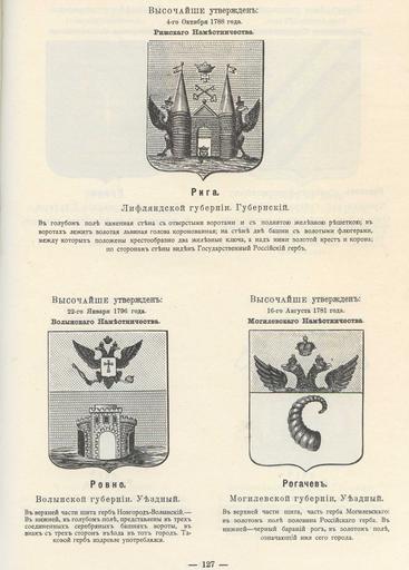 | Keywords: Рига Ровно Рогачев из Винклера.jpg Official Russian Empire coats of arms Ге бы го одов Российской Импе ии Рига Ровно Рогачев с официальными описаниями в Ге бовнике Винкле а П П фон-Винкле Ге бы го одов губе ний областей и посадов Российской Импе ии внесенные в Полное Соб ание законов с 1649 по 1900 год Дозволено цензу ою С -Пете бу г 20 Июля 1899 года Издание книгото говца Ив Ив Иванова С -Пете бу г Типог афия И Комелова П яжка д 3 1899 \ Scanned by Vizu 1899 published П П фон Винкле \ Pavel von Vinkler PD-old PD-RusEmpire PD-RU-exempt Gerbovnik Vinklera - Pages 127 Symbols of Riga History of Rivne |