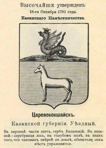 | Keywords: Царевококшайск из Винклера.jpg Official Russian Empire coat of arm Ге б Российской Импе ии уездного го ода Ца евококшайск Казанской губе нии с официальным описанием в Ге бовнике Винкле а П П фон-Винкле Ге бы го одов губе ний областей и посадов Российской Импе ии внесенные в Полное Соб ание законов с 1649 по 1900 год Дозволено цензу ою С -Пете бу г 20 Июля 1899 года Издание книгото говца Ив Ив Иванова С -Пете бу г Типог афия И Комелова П яжка д 3 1899 \ Scanned by Vizu 1781 \ 1899 published П П фон Винкле \ Pavel von Vinkler PD-old PD-RusEmpire PD-RU-exempt coats of arms Gerbovnik Vinklera - City CoAs Coats of arms of Kazan Governorate Horses in art Prints of dragons |
