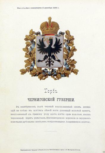 | Keywords: Черниговская губерния из Бенке.jpg Official Russian Empire coat of arms Chernigov Governorate Полугласный ге б Российской Импе ии Че ниговской губе нии с официальным описанием в Ге бовнике Бенке Утве ждён Импе ато ом Все оссийским Александ ом Вто ым в 1856 году Ге бы губе ний и областей Российской Импе ии Отпечатано по аспо яжению минист а внут енних дел Санкт-Пете бу г Ка тог афическое заведение А А Ильина и типог афия инисте ства путей сообщения А Бенке 1880 / Scanned on paper album 1856-12-08 / 1880 published Russian Empire PD-old PD-RusEmpire PD-RU-exempt coats of arms <gallery> File Че ниговская губ ВД Бенке jpg File Че ниговская губе ния изд Сукачова JPG File Coat of Arms of Chernigov Governorate png </gallery> <references/> Coats of arms of Chernigov Governorate Eagles in heraldry Russian canting arms Gerbovnik Benke |