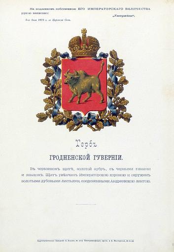 | Keywords: Гродненская губерния из Бенке.jpg Official Russian Empire coat of arms Grodno Governorate Ге б Российской Импе ии Г одненской губе нии с официальным описанием в Ге бовнике Бенке Утве ждён Импе ато ом Все оссийским Александ ом Вто ым Ге бы губе ний и областей Российской Импе ии Отпечатано по аспо яжению минист а внут енних дел Санкт-Пете бу г Ка тог афическое заведение А А Ильина и типог афия инисте ства путей сообщения А Бенке 1880 / Scanned on paper album 1878 / 1880 published Russian Empire PD-old-100 PD-RusEmpire PD-RU-exempt coats of arms <gallery> File Г одненская губ ВД Бенке jpg File Г одненская губе ния изд Сукачова A JPG File Г одненская губе ния изд Сукачова JPG File Coat of Arms of Grodno Governorate png </gallery> Coats of arms of Grodno Governorate Gerbovnik Benke Buffalo in heraldry |
