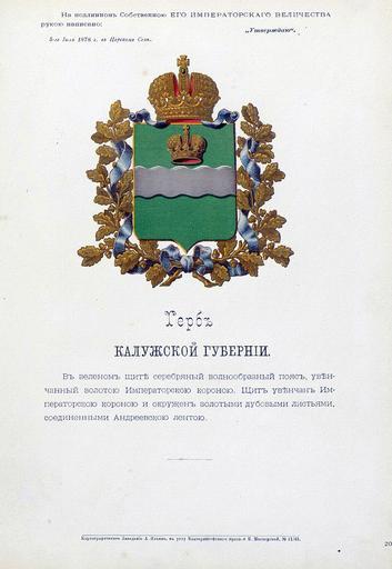 | Keywords: Калужская губерния из Бенке.jpg Official Russian Empire coat of arms Kaluga Governorate Ге б Российской Импе ии Калужской губе нии с официальным описанием в Ге бовнике Бенке Утве ждён Импе ато ом Все оссийским Александ ом Вто ым Ге бы губе ний и областей Российской Импе ии Отпечатано по аспо яжению минист а внут енних дел Санкт-Пете бу г Ка тог афическое заведение А А Ильина и типог афия инисте ства путей сообщения А Бенке 1880 / Scanned on paper album 1878 / 1880 published Russian Empire PD-old-100 PD-RusEmpire PD-RU-exempt coats of arms Coats of arms of Kaluga Governorate Gerbovnik Benke Crowns in heraldry |