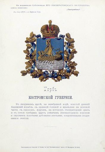 | Keywords: Костромская губерния из Бенке.jpg Official Russian Empire coat of arms Kostroma Governorate Ге б Российской Импе ии Кост омской губе нии с официальным описанием в Ге бовнике Бенке Утве ждён Импе ато ом Все оссийским Александ ом Вто ым Ге бы губе ний и областей Российской Импе ии Отпечатано по аспо яжению минист а внут енних дел Санкт-Пете бу г Ка тог афическое заведение А А Ильина и типог афия инисте ства путей сообщения А Бенке 1880 / Scanned on paper album 1878 / 1880 published Russian Empire PD-old-100 PD-RusEmpire PD-RU-exempt coats of arms Coats of arms of Kostroma Governorate Gerbovnik Benke Boats in heraldry Volga in heraldry |