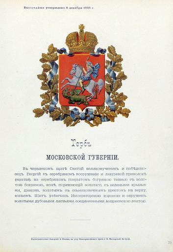 | Keywords: Московская губерния из Бенке.jpg Official Russian Empire coat of arms Moskva Governorate Ге б Российской Импе ии осковской губе нии с официальным описанием в Ге бовнике Бенке Утве ждён Импе ато ом Все оссийским Александ ом Вто ым в 1878 году Ге бы губе ний и областей Российской Импе ии Отпечатано по аспо яжению минист а внут енних дел Санкт-Пете бу г Ка тог афическое заведение А А Ильина и типог афия инисте ства путей сообщения А Бенке 1880 / Scanned on paper album 1856 / 1880 published Russian Empire PD-old PD-RusEmpire PD-RU-exempt coats of arms File Coat of Arms of Moscow gubernia Russian empire png <references/> Coats of arms of Moscow Governorate Gerbovnik Benke Saint George and the Dragon in heraldry Dragons in heraldry |