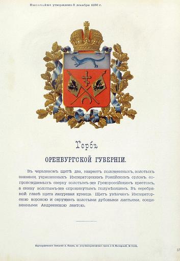 Keywords: Оренбургская губерния из Бенке.jpg Official Russian Empire coat of arms Orenburg Governorate Ге б Российской Импе ии О енбу гской губе нии с официальным описанием в Ге бовнике Бенке Утве ждён Импе ато ом Все оссийским Александ ом Вто ым в 1878 году Ге бы губе ний и областей Российской Импе ии Отпечатано по аспо яжению минист а внут енних дел Санкт-Пете бу г Ка тог афическое заведение А А Ильина и типог афия инисте ства путей сообщения А Бенке 1880 / Scanned on paper album 1856 / 1880 published Russian Empire PD-old PD-RusEmpire PD-RU-exempt flags <gallery> File О енбу гская губе ния из Бенке jpg File О енбу гская губе ния изд Сукачова jpg File Coat of Arms of Orenburg gubernia Russian empire png </gallery> Coats of arms of Orenburg Governorate Gerbovnik Benke Crosses in heraldry Flags in heraldry 1 crescent Or in heraldry |