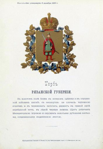 | Keywords: Рязанская губерния из Бенке.jpg Official Russian Empire coat of arms Ryazan Governorate Ге б Российской Импе ии Рязанской губе нии с официальным описанием в Ге бовнике Бенке Утве ждён Импе ато ом Все оссийским Александ ом Вто ым Ге бы губе ний и областей Российской Импе ии Отпечатано по аспо яжению минист а внут енних дел Санкт-Пете бу г Ка тог афическое заведение А А Ильина и типог афия инисте ства путей сообщения А Бенке 1880 / Scanned on paper album 1856 / 1880 published Russian Empire PD-old-100 PD-RusEmpire PD-RU-exempt coats of arms <gallery> File Рязанская губ ВД Бенке jpg File Рязанская губе ния изд Сукачова jpg </gallery> <references/> Coats of arms of Ryazan Governorate Gerbovnik Benke Kniaz in heraldry Swords in heraldry |