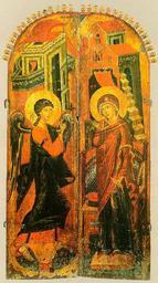 | Keywords: Благовештение-Ботун.JPG mk Композицијата Благовештение од XV век Димензии 119 x 62 cm Темпе а Гипсен г унд на штица Од ц квата Св Бого одица во с Ботун Ох идско Денес во гале ијата на икони Ох ид http //www soros org mk/konkurs/019/i50golema htm author century 15 PD-old-100 PD-old-100 FAL Icons of the Republic of Macedonia Church of the Theotokos Botun Icons of Annunciation with yarn Ohrid Icon Gallery | ||||