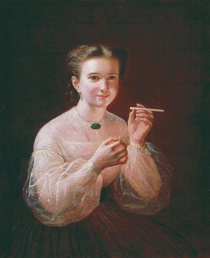 | Keywords: Девушка с папиросой.jpg artwork Portrait of female девушки с папи осой girl with a cigarette Nineteenth century young woman apparently about to smoke a cigarette though this was not considered very feminine or lady-like at the time s 1830 http //vsdn ru/museum/catalogue/exhibit11009 htm Size cm 85 0 67 5 Creator Petr Zabolotskiy Institution Yekaterinburg Museum of Fine Arts oil canvas <gallery> File 1850 Zabolotskiy Girl with a cigarette anagoria JPG </gallery> PD-old-auto-1923 1866 Paintings by Petr Zabolotskiy Portrait paintings of unidentified women of Russia Smoking women in art |