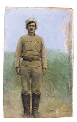 Keywords: Иван Павлович Похитонов - Мой охранник Иван, Красной гвардии.jpg Artwork Creator Ivan Pokhitonov ой ох анник Иван К асной гва дии Mon gardien le garde-rouge Ivan 1919 oil panel cm 13 3 8 2 object history Provenance Boris Wulfert Pokhitonov ; Gifted by the above's son John Wulfert Pokhitonov to the father of the present owner credit line signed 'I Pokhitonow ' lower right ; with inscription and number ' No 498/'Ivan - le garde rouge'/ à Goratchi Klioutch pres sic Ekaterin/en 1919' on the reverse accession number Christie's online 5146227 PD-old-auto 1923 Ivan Pokhitonov Portrait paintings of men 1919 paintings from Russia