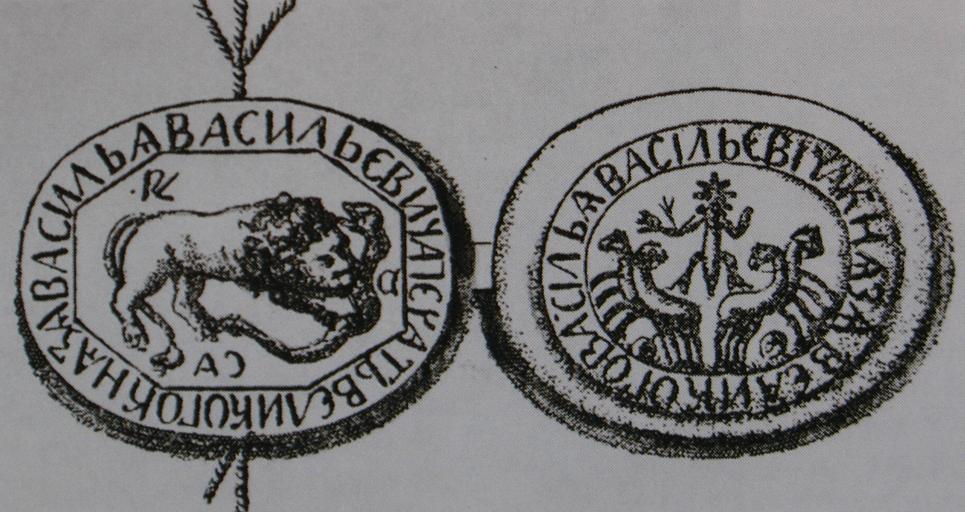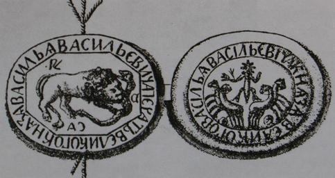 Keywords: Печать Василия Васильевича духовная 1462.JPG en The seal of Vasily II Василия Васильевича Тёмного на духовном завещании 1462 год а ней изоб ажён возница п авящий четвё кой лошадей скачущих в азные сто оны две налево две нап аво с изоб ажение Ильи-п о ока на иконе Own photo / Иван Т етий ЖЗЛ осква Unk century 15 1462 PD-art-100 Historical coats of arms of Russia Seals of medieval Russia Seals of Ivan III of Russia Vasily II of Moscow Snakes in heraldry Tigers in heraldry Horses in heraldry Apollo |