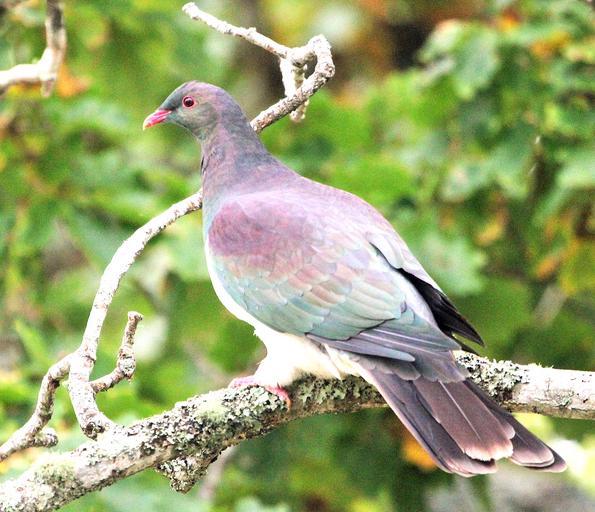 | Keywords: kereru new zealand native brids newzealandnativebrids birds pigeons wind soar outdoor animal New Zealand Kereru This large and distinctively-coloured pigeon is a familiar sight to many New Zealanders. This is because the New Zealand pigeon (or kereru) has a widespread distribution through the country, being present in extensive tracts of native forest, and rural and urban habitats, including most cities. As well as allowing close approach, it often roosts conspicuously, such as on powerlines or on the tops of trees. The distinctive sound of its wing beats in flight also draws attention. Kereru also frequently feature on works of art, such as paintings and sculptures. However, even though it is widespread, like many forest birds its abundance is severely compromised by introduced mammals, particularly possums, stoats and ship rats. Only where these pests are not present (predator-free islands) or are controlled to low levels do kereru populations thrive. Identification Although there is some individual variation, in general the upper parts of adult kereru are blue-green, with a purple-bronze iridescence on the neck, mantle and coverts of the wings. The underparts are white with a sharp demarcation between the white and blue-green on the upper breast. The bill colouration is quite variable, from uniformly red, but often having a paler red or even orangey tip, and feet and eyes crimson. Fledglings and juveniles have duller plumage, and often the white chest is smudgy white-grey, and the demarcation between dark and white feathering is ragged and may have a narrow border of cinnamon wash over the upper white feathers. Voice: kereru are generally silent except for occasional ‘oos’. Brief, moderate volume ‘oos’ are given when alarmed, such as a harrier flying close by, and longer, low volume ‘oooooos’, with a rising tone towards the end given as contact calls, often repeated several times. There is no other species in New Zealand that looks similar to the New Zealand pigeon, apart from the Chatham Island pigeon, which is confined to the Chatham Islands. Distribution Kereru are widespread through the country from Northland to Stewart Island, and on some offshore islands that have suitable forest / shrubland habitats. Habitat Kereru inhabit a wide variety of forest types: podocarp-broadleaf forest, beech forest, second growth native forest regenerating after logging, small forest remnants, and exotic plantations (especially those with an understorey and/or stream-sides of native shrubs and trees). They also occur in farmland shelterbelts, urban parks, and rural and suburban gardens. New Zealand Kereru This large and distinctively-coloured pigeon is a familiar sight to many New Zealanders. This is because the New Zealand pigeon (or kereru) has a widespread distribution through the country, being present in extensive tracts of native forest, and rural and urban habitats, including most cities. As well as allowing close approach, it often roosts conspicuously, such as on powerlines or on the tops of trees. The distinctive sound of its wing beats in flight also draws attention. Kereru also frequently feature on works of art, such as paintings and sculptures. However, even though it is widespread, like many forest birds its abundance is severely compromised by introduced mammals, particularly possums, stoats and ship rats. Only where these pests are not present (predator-free islands) or are controlled to low levels do kereru populations thrive. Identification Although there is some individual variation, in general the upper parts of adult kereru are blue-green, with a purple-bronze iridescence on the neck, mantle and coverts of the wings. The underparts are white with a sharp demarcation between the white and blue-green on the upper breast. The bill colouration is quite variable, from uniformly red, but often having a paler red or even orangey tip, and feet and eyes crimson. Fledglings and juveniles have duller plumage, and often the white chest is smudgy white-grey, and the demarcation between dark and white feathering is ragged and may have a narrow border of cinnamon wash over the upper white feathers. Voice: kereru are generally silent except for occasional ‘oos’. Brief, moderate volume ‘oos’ are given when alarmed, such as a harrier flying close by, and longer, low volume ‘oooooos’, with a rising tone towards the end given as contact calls, often repeated several times. There is no other species in New Zealand that looks similar to the New Zealand pigeon, apart from the Chatham Island pigeon, which is confined to the Chatham Islands. Distribution Kereru are widespread through the country from Northland to Stewart Island, and on some offshore islands that have suitable forest / shrubland habitats. Habitat Kereru inhabit a wide variety of forest types: podocarp-broadleaf forest, beech forest, second growth native forest regenerating after logging, small forest remnants, and exotic plantations (especially those with an understorey and/or stream-sides of native shrubs and trees). They also occur in farmland shelterbelts, urban parks, and rural and suburban gardens. |