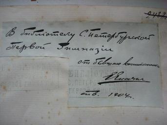 | Keywords: Дарственная надпись Е. Елачича в его книге Происхождение видов и Дарвинизм..jpg ru Да ственная надпись и автог аф бывшего воспитанника 1-ой Санкт-Пете бу гской гимназии Е Елачича в его книге «П оисхождение видов и Да винизм» пода ок библиотеке гимназии 1904 год 1904 School's Museum collection 321 School St Petersburg The address of museum 191119 Russia Saint-Petersburg Socialisticheskaya St 7 / Pravdy St 11 phone +7 812 764-86-38 e-mail sch321 center-edu/spb/ru Elachich Evgeny Aleksandrovich PD-1923 PD-old-70-1923 Uploaded with UploadWizard The First Saint-Petersburg Gymnasium St Petersburg Russia Signatures of writers from Russia |