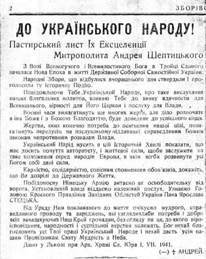 | Keywords: Пастирський лист митрополита Андрея Шептицького, 1 липня 1941 року.jpg uk До Ук аїнського а оду Пасти ський лист Їх Екселєнції ит ополита Анд ея Шептицького 1 липня 1941 оку en To the Ukrainian people Their pastoral letter Ekselyentsiyi Andrey Sheptytsky July 1 1941 fr Pour le peuple ukrainien Leur lettre pastorale Ekselyentsiyi Andrey Sheptytsky Juillet 1 1941 de Um das ukrainische Volk Ihre Hirtenbrief Ekselyentsiyi Andrey Sheptytsky 1 Juli 1941 2013-06-08 22 53 38 Газета Збо івські вісті 31 липня 1941 оку ит ополит Анд ей Шептицький PD-old-auto 1941 Uploaded with UploadWizard Ukraine in World War II Andrey Sheptytsky |