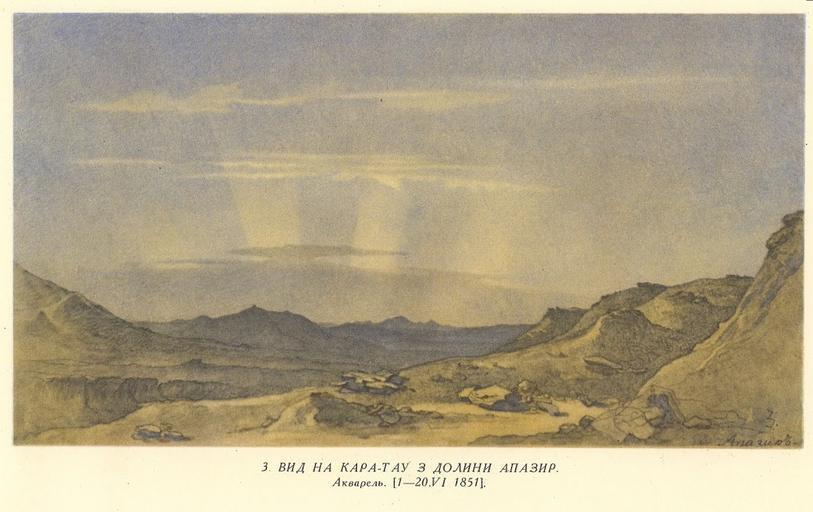 | Keywords: Вид на Кара-Тау з долини Апазир.jpg uk Та ас Шевченко Вид на Ка а-Тау з долини Апази Папі аква ель 15 6 × 28 4 1 20 VI 1851 2014-03-07 17 34 07 http //izbornyk org ua/shevchenko/shev7 htm Creator Taras Shevchenko PD-old-100 Uploaded with UploadWizard Paintings by Taras Shevchenko Kazakhstan in art 1851 paintings in Ukraine |