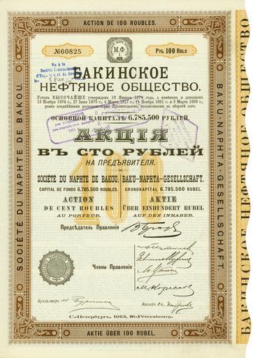 | Keywords: Бакинское нефтяное общество, С.-Петербург, 1913, акция в 100 руб.jpg ru Titel Baku-Naphta-Gesellschaft / Société du Naphte de Bakou Titel Russisch Бакинское нефтяное общество Ort e St Petersburg Land Russland Aserbaidschan Beschreibung St -Petersburg 1913 Aktie über 100 Rubel 60825 34 6 x 23 8 cm braun ocker Stempel OU KR rechts Wellenschnitt dreisprachig Russisch Französisch Englisch Beschreibung Russisch С -Пете бу г 1913 акция в 100 уб 60825 34 6 x 23 8 см ко ичневый светло-ко ичневый печати подлинные подписи остатки купонов сп ава волнооб азный об ез на усском ф анцузском и английском языках 1913 Taken from http //www hwph de/historische-wertpapiere/losnr-auktnr-pa15-1292 html this site Бакинское нефтяное общество Custom license marker 2014 03 26 PD-old-100 Uploaded with UploadWizard 1913 in Baku |