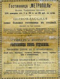 | Keywords: Реклама гостиницы Метрополь.jpg ru Рекламное объявление гостиницы ет ополь г осква 1894 осква белокаменная Путеводитель сп авочник и ад есный указатель по оскве и её ок естностям Това ищество ско опечатни А А Левенсон 1894 С 10 author PD-old-70-1923 Uploaded with UploadWizard Hotel Metropol Moscow |