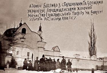 | Keywords: Городищенський монастир. Загін отамана Йосипа Біденка палить російські книжки.jpg uk П авославний монасти у селі Го одище Заславського повіту Волинської губе нії Загін отамана Йосипа Біденка п оводить «ук аїнізацію» че ез спалення осійських книжок апис на світлині АТА А БІДЕ КО З СТАРШИ А И ТА КОЗАКА И УКРАІ ІЗУЄ ГОРОДИЩЕ СЬКИЙ ЖІ ОЧИЙ О АСТИР ІЗЯСЛАВСЬКОГО ПОВІТУ А ВОЛИ І ГОРЯТЬ РОСІИСЬКИ К ИГИ http //www istpravda com ua/artefacts/2010/12/5/7676/ author 1918 1919 Yosyp Bidenko Carmelite Monastery in Horodyšče Ukrainization Burning books PD-old-70-1923 |