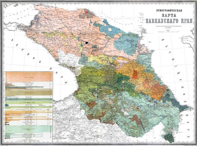 | Keywords: Этнографическая карта Кавказского края (1880 г.)..jpg ru Этног афическая ка та Кавказского к ая 1880 г асштаб 1 1080000 de Ethnographische Karte von Kaukasien im jahre 1880 Maßstab 1 1080000 1880 Издан ка тог афическом заведением Алексе́я Афиноге́новича Ильи́на <small> п имечание Г ави овал ка ту А Ю генс В левом нижнем углу ка ты показана таблица с на одностями населяющими Кубань и Кавказ </small> в Санкт-Пете бу ге а потом пе епечатан на немецком языке в п естижном жу нале «Геог афические записки Пете манна» «Petermanns Geographische Mitteilungen https //archive org/stream/bub_gb_7pY3XpxYNssC page/n396/mode/1up 26 Band im jahre 1880 seiten 364» Данные о население Кавказского К ая являются официальными и относятся в основном к каме альным описаниям 1873-1876 гг Каме альные описание п оводились в Став опольской Кутаисской Тифлисской Э иванской Елизаветпольской Бакинской губе ниях и Закатальском ок уге 1873-ем году; в Те ской области Че номо ском ок уге и Сухумском отдьле 1874-ом году; в Дагестанской области 1873-1875 гг ; в Кубанской области 1876-ом году <br/><small>П имичание <br/> Ка сская область уч еждена 1 нояб я 1877 г п иказ по Кавказской а мии и Кавказскому военному ок угу от 1 нояб я 1877 г за 409 а Батумская область 1878 г Указом Александ а II оба на те ито ии отошедшей от Османской импе ии завоеванные Батумский санджак Т абзонского вилайета >> пе еделано в Батумскую область Ка сский и Чалды ский санджаки Э зу умского вилайета >> объединено и пе еделано в Ка сскую область к России по езультатам усско-ту ецкой войны 1877 1878 гг согласно Бе линскому т актату </small> Original from http //www etomesto ru/karta1095/ www etomesto ru Ка ту составил главный едакто и цензо Кавказского статистического комитета иколай Ка лович Зейдлиц PD-RusEmpire other versions <gallery> File Этног афическая ка та Ка сской области 1880 г jpg File Этног афическая ка та Сигнахского уезда 1880 г jpg File Этног афическая ка та Ленко анского уезда 1880 г jpg </gallery> PD-Art-100 Uploaded with UploadWizard Maps of the history of the Caucasus under Russian rule Maps of the history of Nakhichevan Maps of Azerbaijani-inhabited regions Azerbaijani-inhabited regions Maps of the history of Karachay-Cherkessia Maps of the history of Kabardino-Balkaria Maps of the history of Kalmykia Maps of the history of Dagestan Maps of the history of Chechnya Maps of the history of Ingushetia Maps of the history of Adygea Maps of the history of Georgia Maps of the history of Ajaria Maps of the history of South Ossetia Maps of the history of North Ossetia-Alania Maps of the history of Abkhazia 19th-century maps of Azerbaijan 19th-century maps of Georgia Old maps of Elisabethpol Governorate Old maps of Baku Governorate Kars Oblast Old maps of Viceroyalty of the Caucasus 1880 maps of Russia |