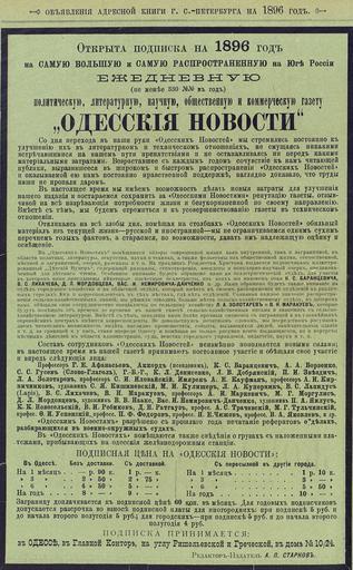 | Keywords: Реклама газеты Одесские новости, 1896.jpg ru Реклама газеты Одесские новости 1896 год 2014-12-19 18 35 21 авто часть ссылка часть заглавие Ад есная книга го ода С -Пете бу га на 1896 год о игинал ссылка викитека ответственный Ред П О Яблонский издание место СПб издательство Лештуковская па овая ско опечатня П О Яблонского год 1896 том ст аницы столбцы ст аниц се ия ти аж author other versions PD-old-70-1923 Uploaded with UploadWizard Advertisements for newspapers of Russia History of Odessa |