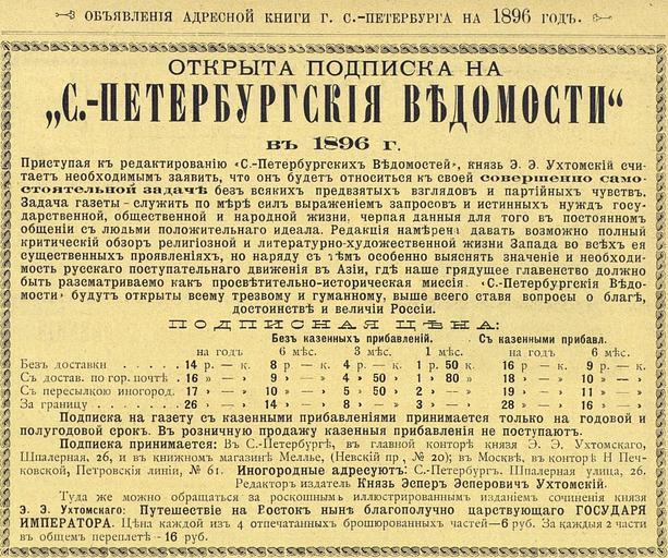 | Keywords: Реклама газеты Санкт-Петербургские ведомости, 1896.jpg ru Реклама газеты Санкт-Пете бу гские ведомости 1896 год 2014-12-19 19 39 47 авто часть ссылка часть заглавие Ад есная книга го ода С -Пете бу га на 1896 год о игинал ссылка викитека ответственный Ред П О Яблонский издание место СПб издательство Лештуковская па овая ско опечатня П О Яблонского год 1896 том ст аницы столбцы ст аниц се ия ти аж author other versions PD-old-70-1923 Uploaded with UploadWizard Advertisements for newspapers of Russia Newspapers published in Saint Petersburg |