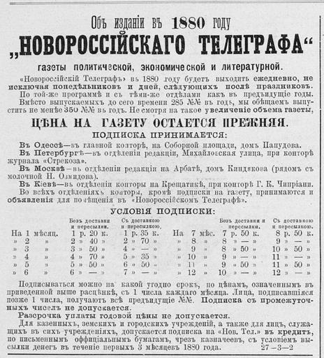 | Keywords: Реклама газеты Новороссийский Телеграф, 1880.jpg ru Реклама газеты ово оссийский Телег аф 1880 год 2015-02-22 03 02 26 Всеми ная иллюст ация жу нал 1880 Т XXIII 574 С 46 Авто неизвестен other versions PD-old-70-1923 Uploaded with UploadWizard Vsemirnaya Illyustratsia magazine Advertisements for newspapers of Russia |