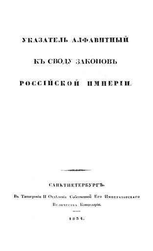 | Keywords: Свод законов. Алфавитный указатель (1834).jpg ru Свод законов Алфавитный указатель 1834 http //dlib rsl ru/viewer/01005402765 page 5 Russian Imperial Chancellery other versions Custom license marker 2015 07 02 PD-old Uploaded with UploadWizard Law of the Russian Empire |