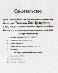 | Keywords: Чашник свидетельство.jpg ru Свитедельство об окончании Ильёй Чашником Витебского художественно-п актического института в 1922 году 1922 Ракитин В Илья Чашник Художник нового в емени 2000 С 20 Авто а нет PD-Russia-2008 Uploaded with UploadWizard Ilya Chashnik |