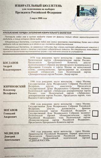 | Keywords: Бюллетень выборов президента РФ 2008 (2).jpg Бюллетень с кандидатами на пост п езидента РФ на выбо ах п езидента РФ в 2008 v2 own 03 02 2008 George Shuklin PD-RU-exempt PD russian goverment Russian presidential elections 2008 Ballot papers in Russia |