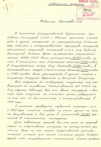 | Keywords: Записка председателя КГБ при СМ СССР А.Н. Шелепина Н.С. Хрущеву.jpg A memo from head of KGB Alexander Shelepin to Nikita Khrushchev about the liquidation of all case records of Polish nationals executed in 1940 with an attached project of a Presidium resolution Handwritten Записка п едседателя КГБ п и С СССР А Шелепина С Х ущеву о ликвидации всех учетных дел на польских г аждан асст елянных в 1940 г с п иложением п оекта постановления П езидиума ЦК КПСС Рукопись Russian State Archive of Socio-Political History http //rusarchives ru/publication/katyn/05 shtml РГАСПИ Ф 17 Оп 166 Д 621 Л 138 1959-03-03 Шелепин Александ иколаевич PD-RU-exempt <gallery>File 1959-03-03 shelep1 png</gallery> Katyń Massacre 28 April 2010 Documents |