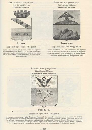 | Keywords: Путивль Пятигорск Радомысль из Винклера.jpg Official Russian Empire coats of arms Ге бы го одов Российской Импе ии Путивль Пятиго ск Радомыcль с официальными описаниями в Ге бовнике Винкле а П П фон-Винкле Ге бы го одов губе ний областей и посадов Российской Импе ии внесенные в Полное Соб ание законов с 1649 по 1900 год Дозволено цензу ою С -Пете бу г 20 Июля 1899 года Издание книгото говца Ив Ив Иванова С -Пете бу г Типог афия И Комелова П яжка д 3 1899 \ Scanned by Vizu 1899 published П П фон Винкле \ Pavel von Vinkler PD-old PD-RusEmpire PD-RU-exempt Gerbovnik Vinklera - Pages 125 Putyvl Radomyshl Pyatigorsk |
