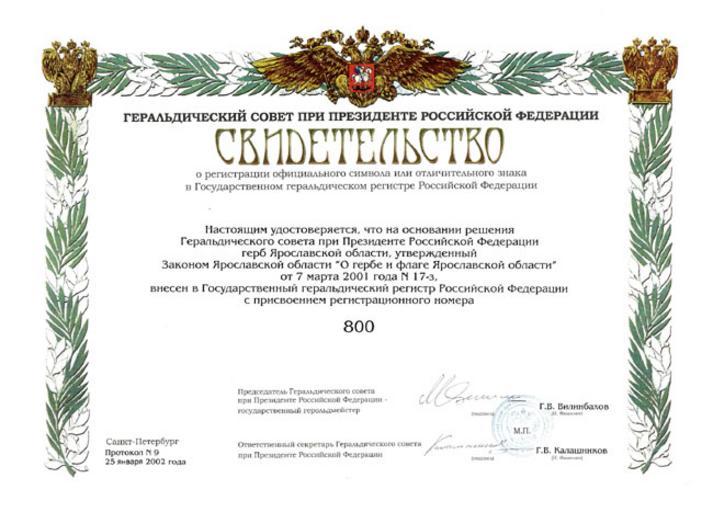 | Keywords: Свидетельство о регистрации герба Ярославской области в Государственном геральдическом регистре РФ.jpg en The certificate of registration of the coat of arms of Yaroslavl region in the State Heraldic Register of the Russian Federation ru Свидетельство о егист ации ге ба Я ославской области в Госуда ственном ге альдическом егист е РФ 2005-04-05 15 31 31 http //www adm yar ru/print_news aspx news_id 466 Ге альдический Совет п и П езиденте РФ PD-RU-exempt Uploaded with UploadWizard Heraldry of Russia |