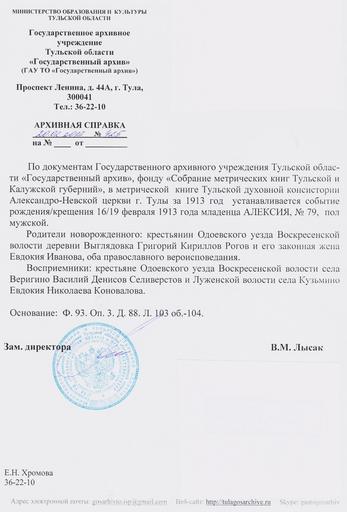 | Keywords: Выписка из метрической книги о рождении А. Г. Рогова.jpg ru Выписка из мет ической книги Тульской духовной консисто ии Александ о- евской це кви го ода Тулы за 1913 год ГАУ ТО ф 93 оп 3 д 88 л 103 об 104 2013-02-20 http //tulagosarchive ru/ State Archive of Tula oblast other versions Custom license marker 2015 08 12 PD-RU-exempt Uploaded with UploadWizard Aleksey Rogov | ||||