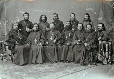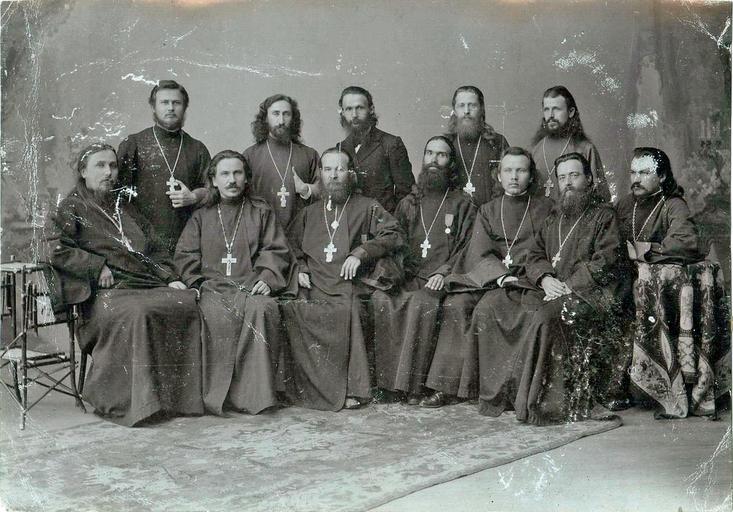 | Keywords: Групповой портрет русских православных священников.jpg ru П авославные священнослужители накануне еволюции В ЦАКе откуда это фото взято утве ждается что на нём изоб ажён будущий мит ополит Владими Богоялвенский однако Это никак не может быть Владими Богоявленский П актически у всех п исутствующих на фотог афии священнослужителей на г уди висит к ест введенный в це ковный обиход госуда ем иколаем Вто ым в 1896 году До этого напе сный к ест носили только п отоие еи как наг аду павловский четы ехконечный он же желтенький с ук ашениями и т д Введенный в упот ебление к ест стал называться николаевским Владими Богоявленский же был укоположен во епископа в 1888 г 1896 и 1913 ЦАК ДА не указано; ЦАК ДА other versions PD-old Priests of the Russian Orthodox Church Unidentified orthodox clergy |