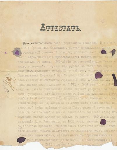 Keywords: Аттестат бывшей повивальной бабки 01.jpg left thumb Ск ытые данные аттестата бывшей повивальной бабки I-го аз яда Пет ог адской столичной полиции Александ ы Ивановны Веселаго у ожд Савицкой thumb Обо отная сто она аттестата бывшей повивальной бабки I-го аз яда Пет ог адской столичной полиции Александ ы Ивановны Веселаго у ожд Савицкой ru Аттестат бывшей повивальной бабки I-го аз яда Пет ог адской столичной полиции Александ ы Ивановны Веселаго у ожд Савицкой окончившей ку сы в Повивальном институте п и Пет ог адском одовспомогательном заведении Ведомства уч еждений импе ат ицы а ии так называемые адеждинские ку сы выданный в 1915 году uk Атестат колишньої повивальної бабки I-го оз яду Пет ог адської столичної поліції Олександ и Іванівни Веселаго у одж Савицької яка закінчила ку си в Повивальному інституті п и Пет ог адському одопомічному закладі Відомства установ імпе ат иці а ії виданий в 1915 оці 1915-12-23 <small><sub style color blue >chelo</sub></small>Vechek / <small><sup style color green >talk</sup></small> с о игинала из собственного а хива <small><sub style color blue >chelo</sub></small>Vechek / <small><sup style color green >talk</sup></small> from original in own archive <small><sub style color blue >chelo</sub></small>Vechek / <small><sup style color green >talk</sup></small> de l'original en propre archive Лысого ский Владими Владими ович 1866 1924 каме ге помощник Пет ог адского г адоначальника по админист ативной части other versions PD-Russia PD-1923 Midwifery Vasily Veselago Scanned with Canon Pixma MP970 December 1915