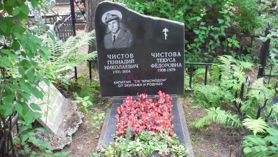 | Keywords: ЧистовГерой.JPG ru Сест о ецкое кладбище Памятник Чистову Геннадию иколаевичу 1931-2004 капитану т/х «К аснодон» балтийского мо ского па оходства Ге ой Социалистического Т уда 1981 год участок 4 own Пёт Иванов 2016 Sestroretsk cemetery Cc-zero |