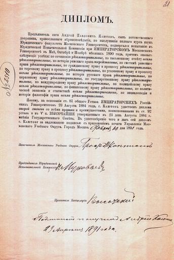 | Keywords: Диплом А.П.Каютова об окончании Императорского Московского Университета в 1891 году.jpg ru Диплом II степени выданный А П Каютову по окончании обучения на Ю идическом факультете Импе ато ского осковского Униве ситета в 1891 году 1891-02-20 ф 418 оп 300 е х 338 О п инятии в число студентов Каютова Анд ея Импе ато ский осковский Униве ситет - other versions PD-old-70-1923 Andrey Kajutov Scanned with Handy Scanner Imperial Moscow University | ||||