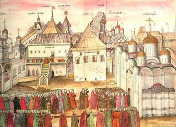 | Keywords: Соборная площадь Московского Кремля 1672-1673.jpg ru Собо ная площадь осковского К емля Слева в подклете - Казенный дво иниатю а из книги Об изб ании на п естол 1672-1673 // Госуда ственная О ужейная палата - 1988 - С 8-9 ок 1672-1673 http //www booksite ru/enciklopedia/towns/25 htm booksite ru author other versions PD-old-70-1923 Cathedral Square Moscow | ||||