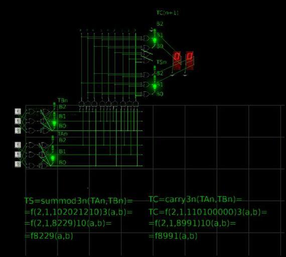 | Keywords: Снимок модели одноразрядного троичного несимметричного полусумматора.JPG ru Снимок модели т оичного полусуммато а в несиммет ичной т оичной системе счисления в т ёхбитной одноединичной системе логических элементов в логическом симулято е Atanua Соб ал сам Анд ей Куликов 2010-06-24 Adders digital circuits |