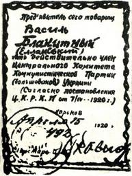 | Keywords: Василь Блакитний мандат ЦК КП(б)У 1920.jpg uk пндат члена ЦК КП б У ук аїнського письменника та політичного діяча Василя Еллана-Блакитного 1920 uk і слова п о спокій Спогади п о Василя Еллана Блакитного Київ Дніп о 1989 author PD-Old other versions Vasyl Ellan-Blakytnyi |