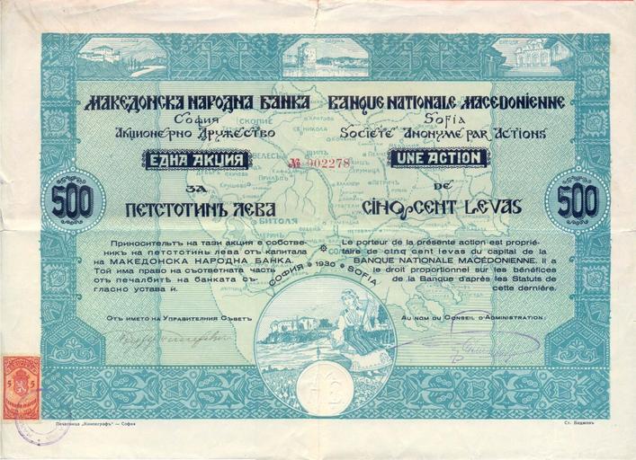 Keywords: Македонска народна банка акция за 500 лева.jpg Акция на акедонската на одна банка scanned 1930 акедонска на одна банка PD-old Makedonska Narodna Banka Stock certificates of banks in Bulgaria Revenue stamps of Bulgaria Revenue stamps on documents Stefan Badzhov |