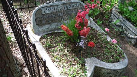 | Keywords: КондратьевП.А.Герой.JPG ru Конд атьевы Пёт Анд еевич и Евгения Павловна в девичестве Львова Они п ожили долгую жизнь и уме ли в один день 2 или 3 июня 1938 года с азницей в 3 часа п ожив вместе более 50 лет Детство их п ошло в Сест о ецке где они и поженились Ста ый де евянный дом Львовых стоит на Угольной улице выходя 5-ю окнами на П имо ское шоссе Свой дом Пёт Анд еевич пост оил в конце XIX века на 2-й Та ховской улице д 46 с баней колодцем ледником са аями хлевом а завод он п ишёл 12-летним ебёнком и п о аботал на нём более 60 лет от мальчика на побегушках до ста шего масте а Политикой не занимался был пог ужён в аботу изоб етателя- ационализато а У него была золотая именная печать Работал с С И осиным До 1917 года стал Почётным г ажданином го ода Сест о ецка В 1929 году за т удовые заслуги был удостоен звания Ге оя т уда а их похо онах было много на ода у заводской п оходной г об Пет а Анд еевича т и аза подняли высоко на вытянутых уках отдав последние почести отпевал их свящённик на дому где г обы стояли на столе под общей изой В Разливе у них была большая семья - семь детей два сына и пять доче ей из кото ых в Блокаду уме ли от голода четве о т и доче и и один сын похо онены в общей б атской могиле на Та ховском кладбище Сын - иколай Пет ович - аботал одним из уководителей Ков овского пулемётного завода а с 1947 года жил в Разливе Из статьи внучки Пет а Анд еевича Аве иной Конд атьевой И в Сбо нике Ку о тный айон Ст аницы исто ии Вып 4 СПб 2009 с 140 ISBN 978-5-94500-066-7 own Пёт Иванов 2016 Sestroretsk cemetery Cc-zero |