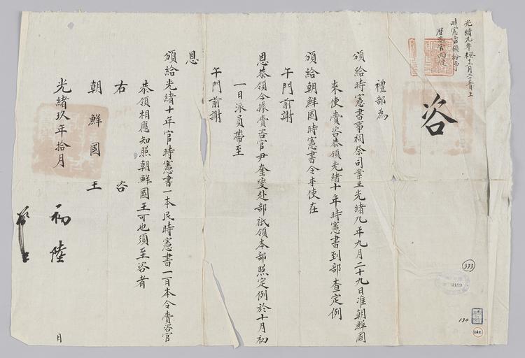 Keywords: 조선-청 외교문서(자문) 093.jpg 고종 20년 1883 10월 6 에 청국 예 에 조선국왕에게 보내 온 문 조선에 파견 헌 재자 에게 에 따 10월 1 에 헌 1본 민 헌 100본 반급하 다고 알리는 내용 다 2016-07-18 http //www nl go kr/nl/search/SearchDetail nl category_code ct service KOLIS vdkvgwkey 1130170 colltype DAN_OLD place_code_info 172 place_name_info EB 94 94 EC A7 80 ED 84 B8 EC 97 B4 EB 9E 8C EC 8B A4 manage_code MA shape_code B refLoc null category srchFlag Y h_kwd E5 8F A4 E6 9C 9D51- EB 8B A428-130 lic_yn N mat_code RB 국립중앙도 조선국왕 청국예 other versions PD-Art Books from National Library of Korea Books from Korea 1883 in Relations of the Joseon Dynasty and the Qing Dynasty |