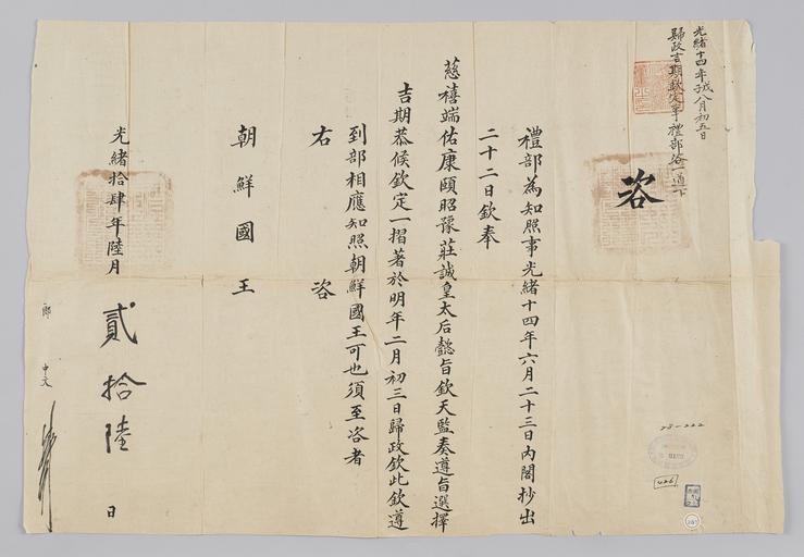 Keywords: 조선-청 외교문서(자문) 155.jpg 고종 25년 1888 6월 26 에 청국 예 에 조선국왕에게 보내 온 문 자 慈禧 황 후 皇太后 정 歸政 길 내년 1889 2월 3 정 欽定 하는 에 해 알리는 내용 다 자 황 후 후 西太后 1835~1908 를 말함 청나 함풍 후궁 며 동치 모 동치 광 조카 섭정 냈다 효 현황후 欽顯皇后 고도 른다 2016-07-18 http //www nl go kr/nl/search/SearchDetail nl category_code ct service KOLIS vdkvgwkey 1129992 colltype DAN_OLD place_code_info 172 place_name_info EB 94 94 EC A7 80 ED 84 B8 EC 97 B4 EB 9E 8C EC 8B A4 manage_code MA shape_code B refLoc null category srchFlag Y h_kwd E5 8F A4 E6 9C 9D51- EB 8B A428-222 lic_yn N mat_code RB 국립중앙도 조선국왕 청국예 other versions PD-Art Books from National Library of Korea Books from Korea 1888 in Relations of the Joseon Dynasty and the Qing Dynasty |