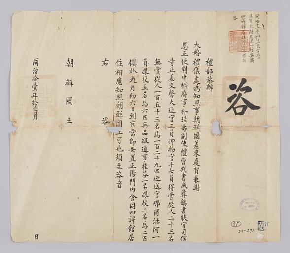 Keywords: 조선-청 외교문서(자문) 214.jpg 고종 9년 1872 11월에 청국 예 에 조선국왕에게 보내 온 문 조선에 파견 청 황 혼 에 경하 慶 겸 사 사 정사 박 수 珪壽 사 성 호 成 鎬 장 강문형 文馨 등 사신 행 9월 6 에 북경에 당도하여 회동 사역 에 머물고 있다고 알리는 내용 다 2016-07-19 http //www nl go kr/nl/search/SearchDetail nl category_code ct service KOLIS vdkvgwkey 1130363 colltype DAN_OLD place_code_info 172 place_name_info EB 94 94 EC A7 80 ED 84 B8 EC 97 B4 EB 9E 8C EC 8B A4 manage_code MA shape_code B refLoc null category srchFlag Y h_kwd E5 8F A4 E6 9C 9D51- EB 8B A428-292 lic_yn N mat_code RB 국립중앙도 조선국왕 청국예 other versions PD-Art Books from National Library of Korea Books from Korea 1872 in Relations of the Joseon Dynasty and the Qing Dynasty |