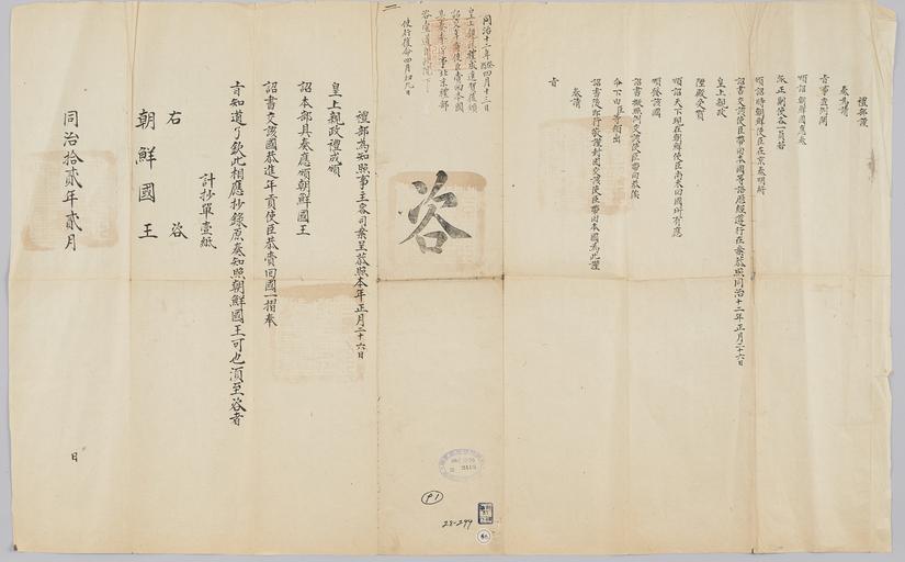 Keywords: 조선-청 외교문서(자문) 221.jpg 고종 10년 1873 2월에 청국 예 에 조선국왕에게 보내 온 문 황 정 親政禮 루어진 후 내린 조 를 연공사신 年貢使臣 돌아 는 편에 보낸다고 알리는 내용 다 2016-07-19 http //www nl go kr/nl/search/SearchDetail nl category_code ct service KOLIS vdkvgwkey 1130351 colltype DAN_OLD place_code_info 172 place_name_info EB 94 94 EC A7 80 ED 84 B8 EC 97 B4 EB 9E 8C EC 8B A4 manage_code MA shape_code B refLoc null category srchFlag Y h_kwd E5 8F A4 E6 9C 9D51- EB 8B A428-299 lic_yn N mat_code RB 국립중앙도 조선국왕 청국예 other versions PD-Art Books from National Library of Korea Books from Korea 1873 in Relations of the Joseon Dynasty and the Qing Dynasty |