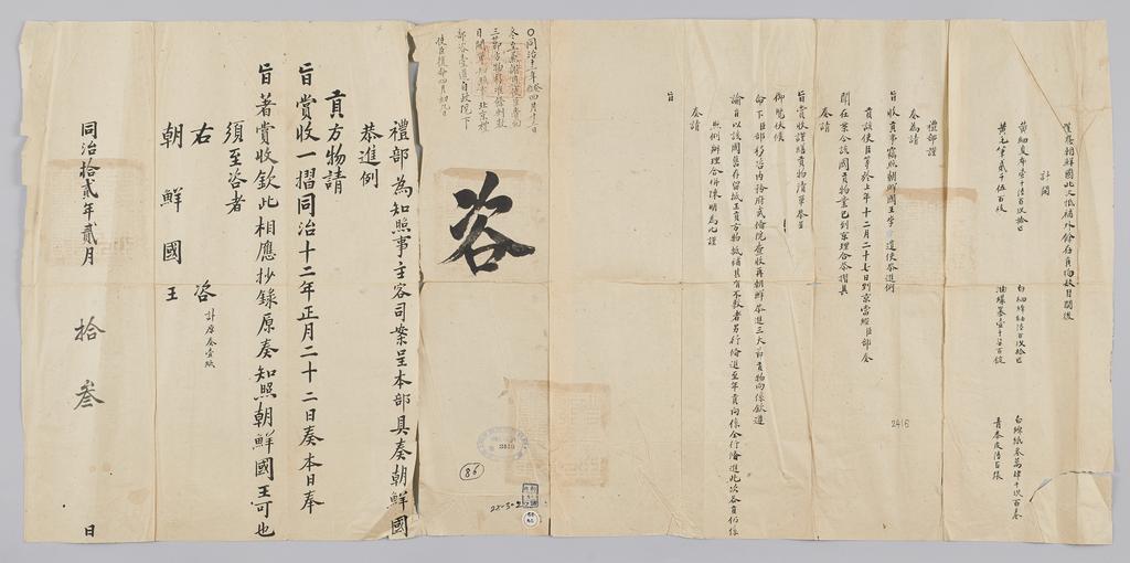 Keywords: 조선-청 외교문서(자문) 224.jpg 고종 10년 1873 2월 13 에 청국 예 에 조선국왕에게 보내 온 문 조선에 파견 동 겸 사 사 온 사신 행 고 온 방물 잘 받았다고 알리는 내용 다 공물 내역 적 있다 2016-07-19 http //www nl go kr/nl/search/SearchDetail nl category_code ct service KOLIS vdkvgwkey 1130356 colltype DAN_OLD place_code_info 172 place_name_info EB 94 94 EC A7 80 ED 84 B8 EC 97 B4 EB 9E 8C EC 8B A4 manage_code MA shape_code B refLoc null category srchFlag Y h_kwd E5 8F A4 E6 9C 9D51- EB 8B A428-302 lic_yn N mat_code RB 국립중앙도 조선국왕 청국예 other versions PD-Art Books from National Library of Korea Books from Korea 1873 in Relations of the Joseon Dynasty and the Qing Dynasty |