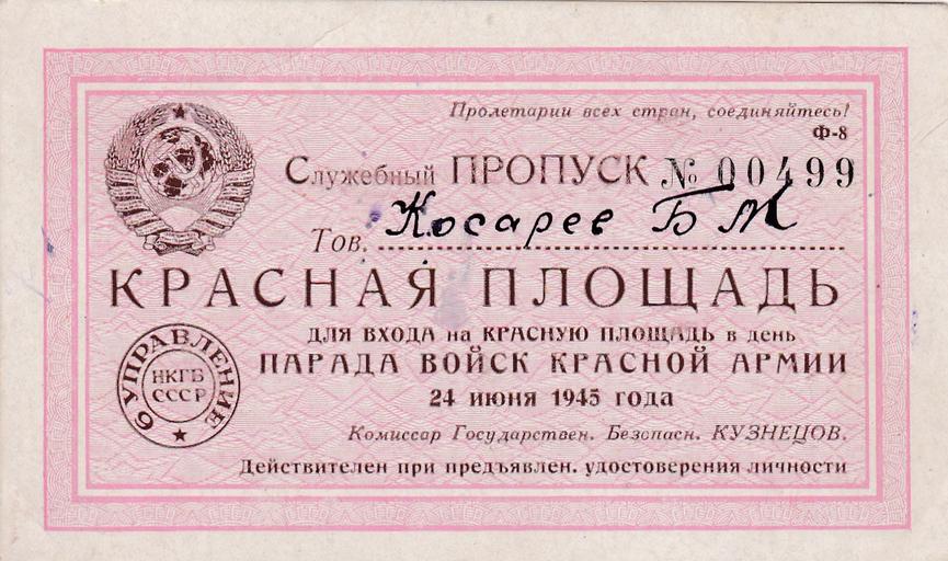 | Keywords: Пропуск Бориса Косарева на Красную Площадь, парад Победы 24 июня 1945 года.jpg ru П опуск Бо иса Коса ева на К асную Площадь па ад Победы 24 июня 1945 года 2014-05-29 20 02 30 own Dar20061 PD-RU-exempt Identity cards of the Soviet Union Press passes Boris Kosarev |