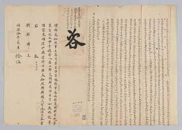 | Keywords: 조선-청 외교문서(자문) 300.jpg 고종 8년 1871 2월 15 에 청국 예 에 조선국왕에게 보내 온 문 해 국경 넘어 도둑질하다 잡힌 조선 동길 吉 모 자 등 8명 경원 慶源 넘긴다고 알리는 내용 다 2016-07-19 http //www nl go kr/nl/search/SearchDetail nl category_code ct service KOLIS vdkvgwkey 1130411 colltype DAN_OLD place_code_info 172 place_name_info EB 94 94 EC A7 80 ED 84 B8 EC 97 B4 EB 9E 8C EC 8B A4 manage_code MA shape_code B refLoc null category srchFlag Y h_kwd E5 8F A4 E6 9C 9D51- EB 8B A428-383 lic_yn N mat_code RB 국립중앙도 조선국왕 청국예 other versions PD-Art Books from National Library of Korea Books from Korea 1871 in Relations of the Joseon Dynasty and the Qing Dynasty |