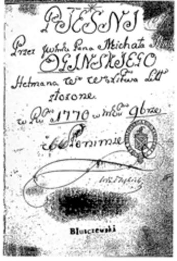 | Keywords: Тытульны аркуш рукапісу песняў Міхала Казіміра Агінскага. 1770 г..png Тытульны а куш укапісу песняў іхала Казімі а Агінскага 1770 г Тытульны а куш укапісу песьняў іхала Казіме а Агінскага 1770 г 1770 http //www free-lancers net/posted_files/NCB78DE8126B3 pdf Зміце Сасноўскі Гісто ыя бела ускіх музычных уплываў невядомы PD-Belarus Music of Belarus Uploaded with VicuñaUploader Michał Kazimierz Ogiński | ||||