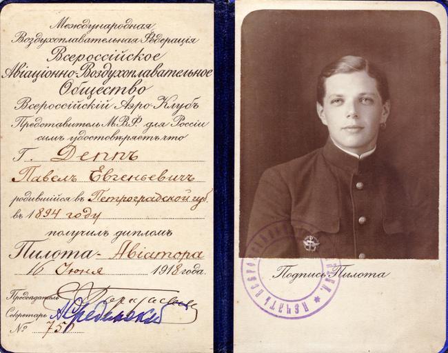 Keywords: Удостоверение летчика Павла Депп 2.jpg ru Удостове ение члена Все оссийского Авиационно-Воздухоплавательного общества выданное Павлу Деппу в 1918 году а хив А И овикова неп едусмот ен фотог афия документа 1918 Paul Dоepp PD-old