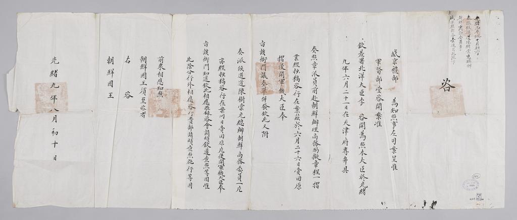 Keywords: 조선-청 외교문서(자문) 333.jpg 고종 20년 1883 8월 10 에 청국 예 에 조선국왕에게 보내 온 문 주조선 판상무 원 駐 鮮總辦商務委員 2품함후선도 二品 選道 진수당 陳樹棠 파견함 알리는 내용 다 1882년 8월에 중간 조청상민수륙무역장정 체결 후 홍장 다 해 1883년 6월 21 에 '판리조선상무장정 辦理 鮮商務章程 ' 보고하고 진수당 판상무 원 조선에 파견하 다 그리고 진수당 해 9월 16 에 성에 도착하여 조선 리아문에 홍장 조선 국왕에게 보낸 자문 전달하고 20 터 업무를 하 다 2016-07-19 http //www nl go kr/nl/search/SearchDetail nl category_code ct service KOLIS vdkvgwkey 1130181 colltype DAN_OLD place_code_info 172 place_name_info EB 94 94 EC A7 80 ED 84 B8 EC 97 B4 EB 9E 8C EC 8B A4 manage_code MA shape_code B refLoc null category srchFlag Y h_kwd E5 8F A4 E6 9C 9D51- EB 8B A428-435 lic_yn N mat_code RB 국립중앙도 조선국왕 청국예 other versions PD-Art Books from National Library of Korea Books from Korea 1883 in Relations of the Joseon Dynasty and the Qing Dynasty |